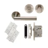 Pack includes a pair of handles, a 5 lever sashlock, a pair of escutcheons, bathroom thumb turn, and pair and half of hinges.