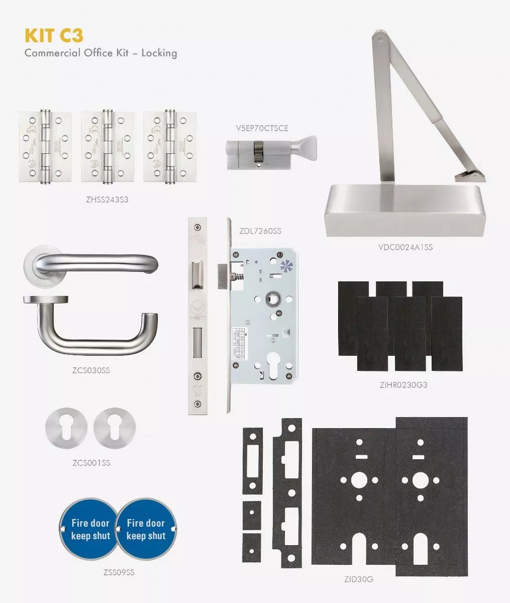 Our complete fire rated door pack offer the ideal solution for internal doors within commercial properites. Each pack uncludes all the hardware components legally required for a fire door whilst providing a cost effective choice for buiders.