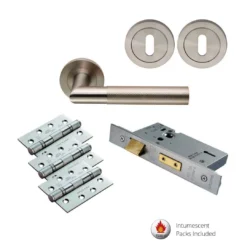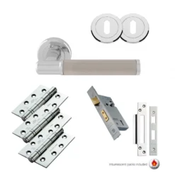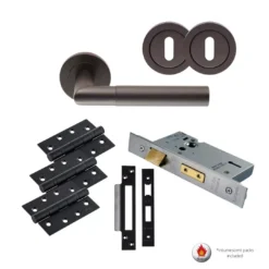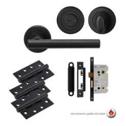 Pack includes a pair of handles, a bolt through 76mm tubular latch, a 76mm tubular deadbolt, bathroom thumb turn, and pair and half of hinges.