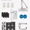 Pack includes a pair of handles, a bolt through 76mm tubular latch, a 76mm tubular deadbolt, bathroom thumb turn, and pair and half of hinges.