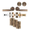 Pack includes a pair of handles, a bolt through 76mm tubular latch, a 76mm tubular deadbolt, bathroom thumb turn, and pair and half of hinges.